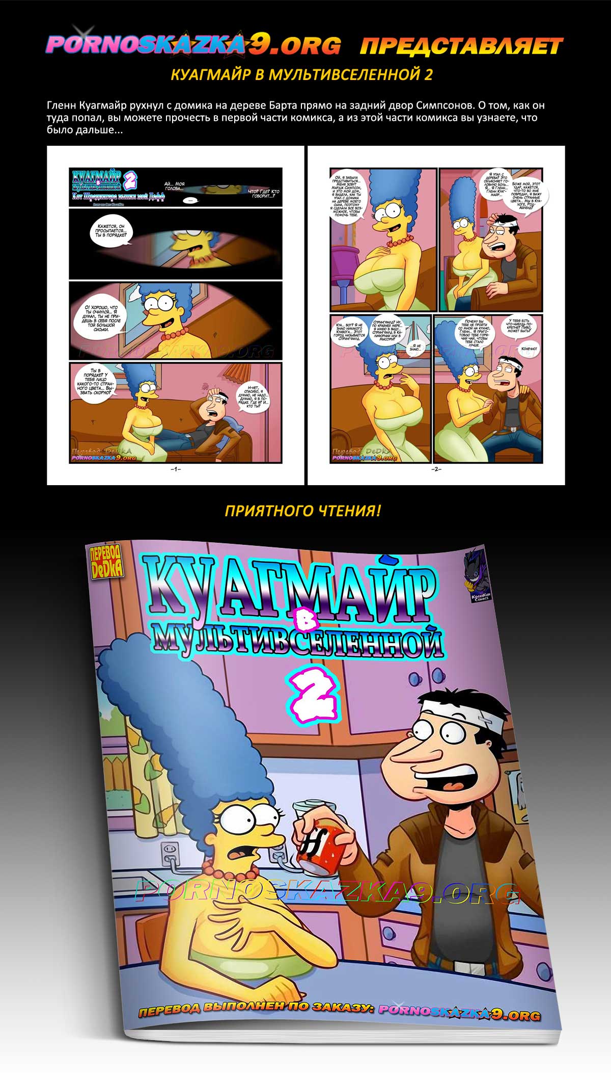 Порно комикс «Куагмайр в мультивселенной. Часть 2: Кот Шредингера выпил мой Дафф». Гленн Куагмайр рухнул с домика на дереве Барта прямо на задний двор Симпсонов. О том, как он туда попал, вы можете прочесть в первой части комикса, а из этой части комикса вы узнаете, что было дальше…