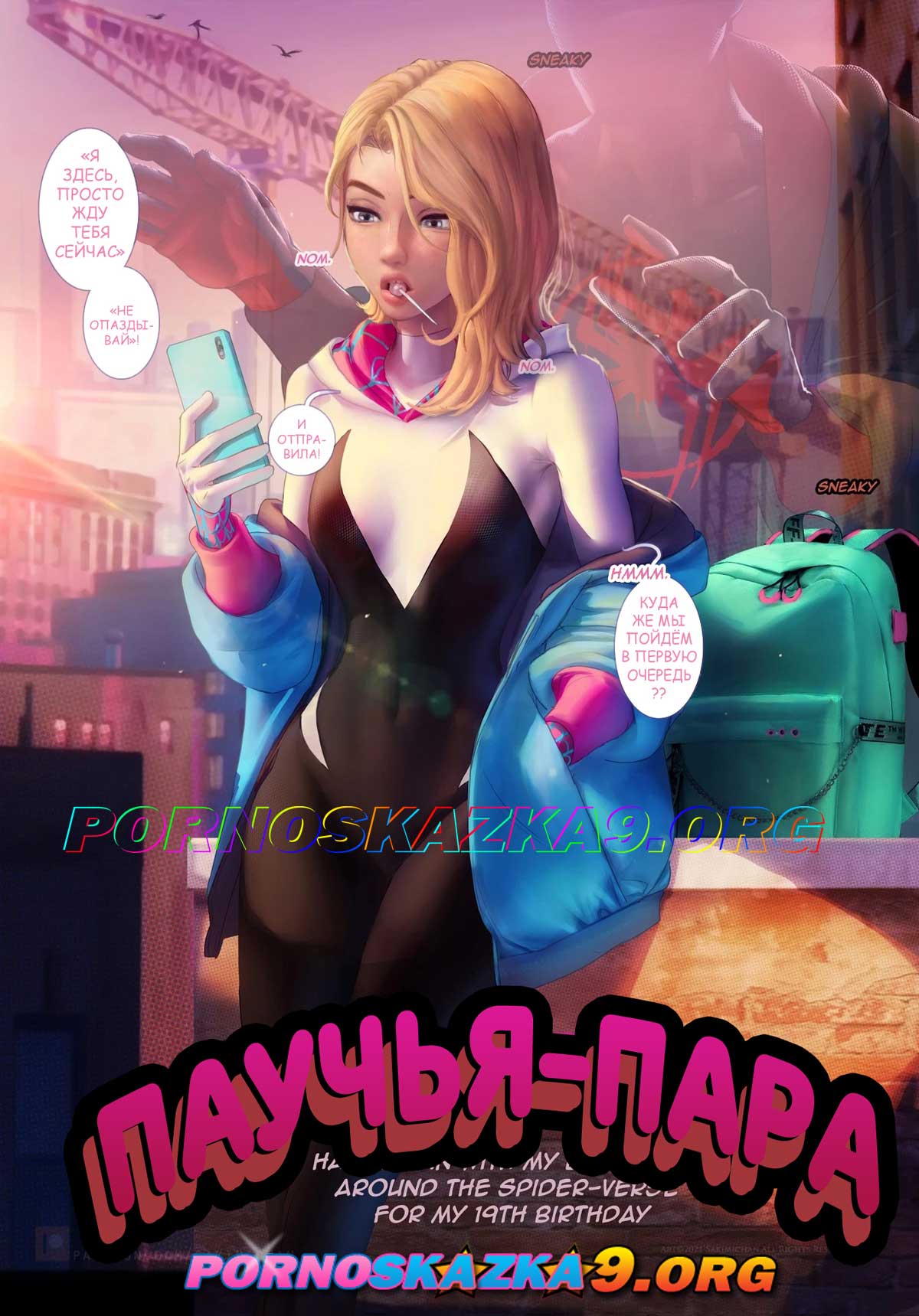 Порно комикс «Паучья пара.» Гвен ждала Майлза, чтобы погулять с ним на свой день рождения. В итоге, встретившись они решили попутешествовать по мирам, где их никто бы не смог увидеть, так как Гвен очень жаждала лишь одного…